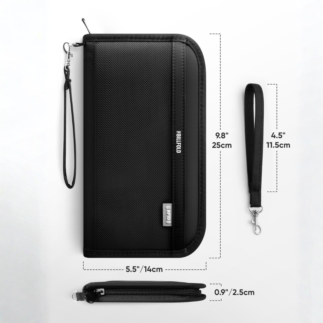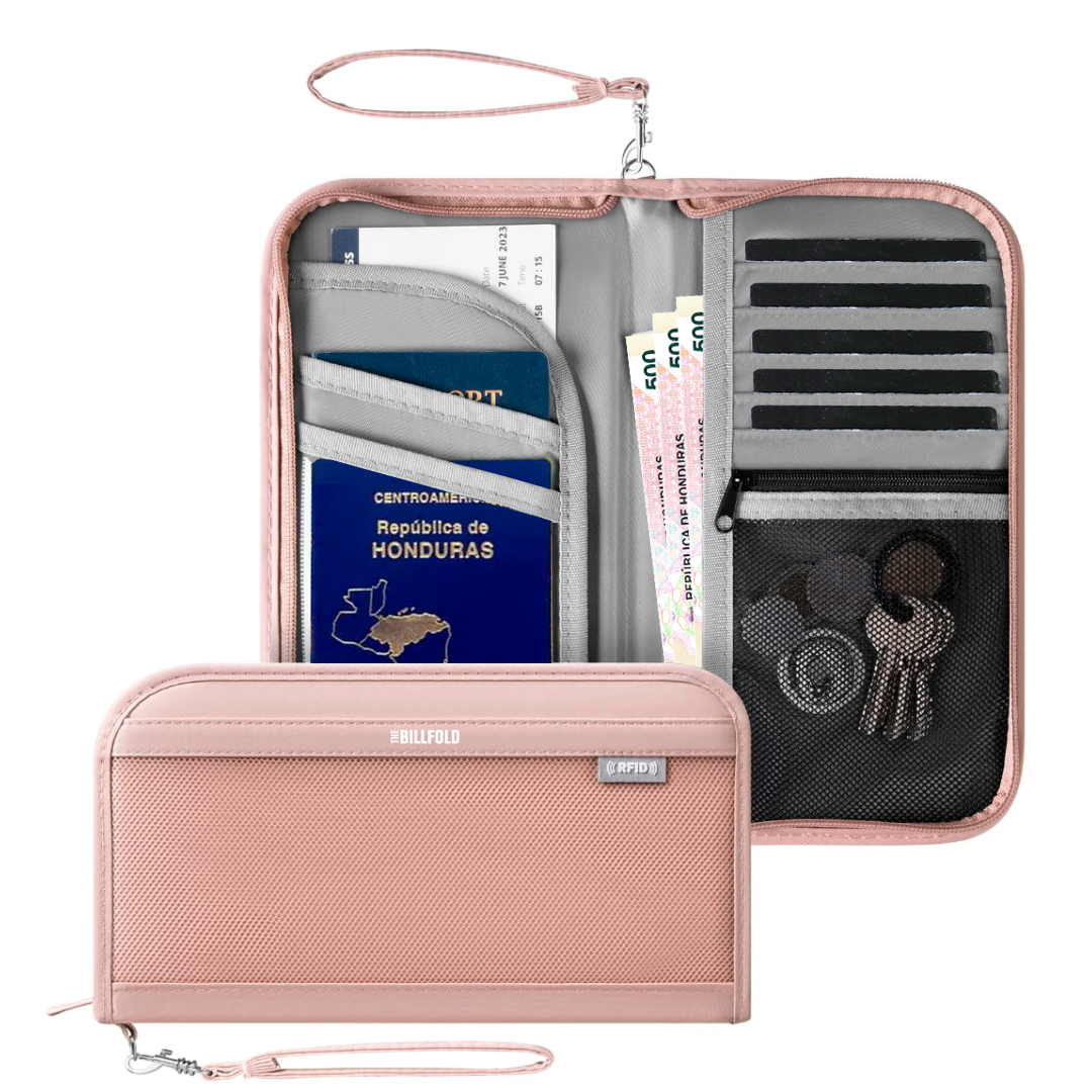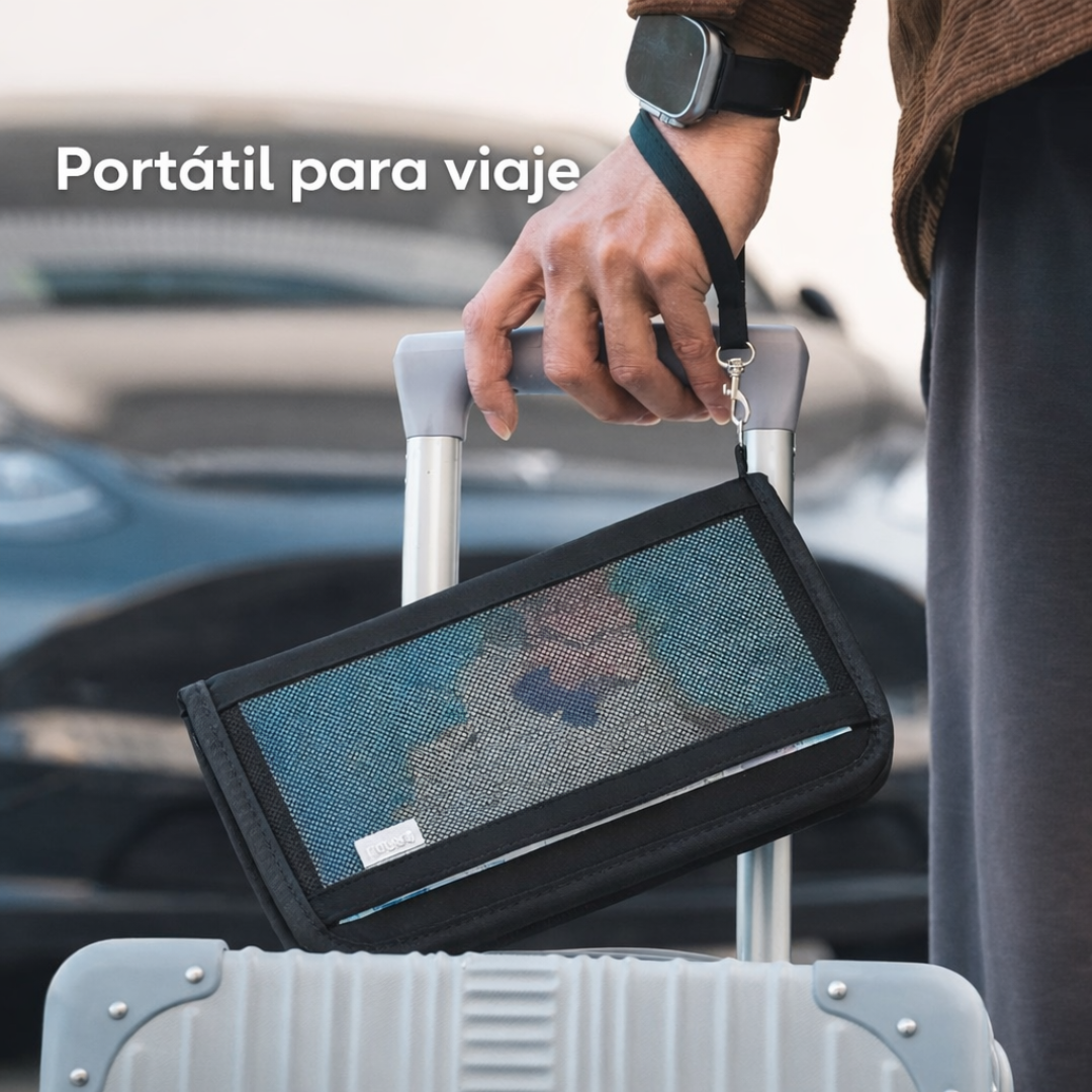 Este portapasaporte súper práctico guarda tus tarjetas, pasaporte, efectivo y accesorios pequeños, y además protege tu información con bloqueo RFID. Perfecto para el día a día o tus viajes.